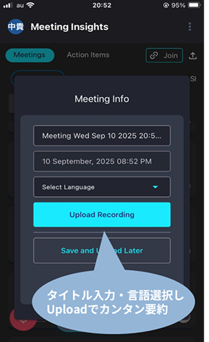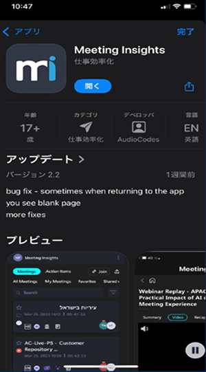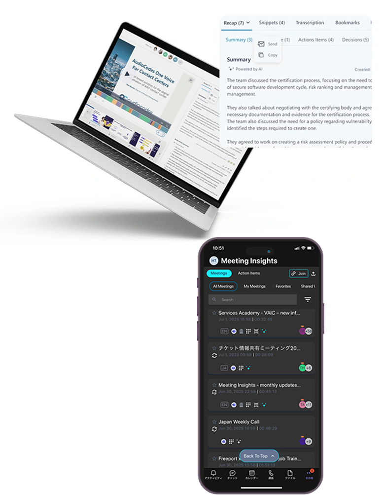 Meeting Insightsモバイルアプリは、アドホック録音機能により、オフィス内での急な打ち合わせや顧客との商談などでもスマートフォンのマイクを使用して簡単に録音・要約作成が可能です。移動中や顧客訪問の合間など、場所を選ばずに全文の文字起こしやAIによる要約を確認し、次の行動に活かすことができます。