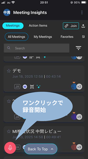 またモバイルアプリでは対面での会議を録音し、AIが議事録を作成します。突然の会議でもワンタッチで組織で共有可能なナレッジベースになります。